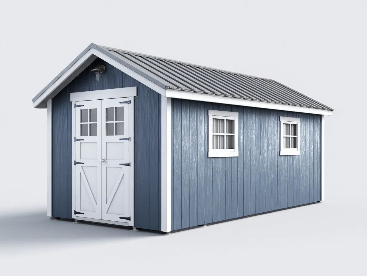 La caseta dispone de puertas dobles frontales que permiten un acceso cómodo al interior. Las ventanas laterales ayudan a mejorar la iluminación natural dentro del espacio, creando un ambiente más claro para almacenar diferentes objetos.