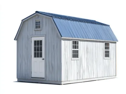 La estructura está fabricada en madera con acabado en color blanco que resalta la estética natural del material y aporta luminosidad al conjunto. El techo metálico inclinado en color azul ayuda a evacuar el agua de lluvia y mejora la protección del interior frente a las condiciones exteriores. La construcción sólida ofrece estabilidad y durabilidad.