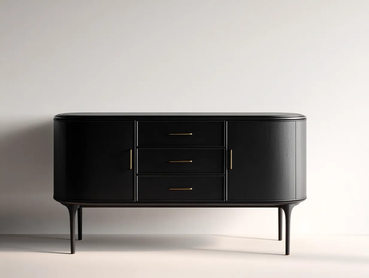 El diseño combina compartimentos cerrados y cajones que permiten organizar diferentes objetos del hogar. Los cajones centrales ofrecen un acceso cómodo para guardar artículos pequeños mientras los compartimentos laterales ayudan a mantener los objetos protegidos y organizados.
