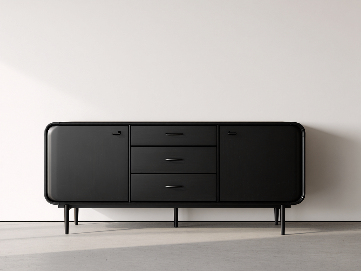 La estructura está fabricada con madera resistente y acabado en color negro que ofrece una apariencia sofisticada y contemporánea. Los tiradores discretos y la base elevada con patas resistentes proporcionan estabilidad y una estética ligera.