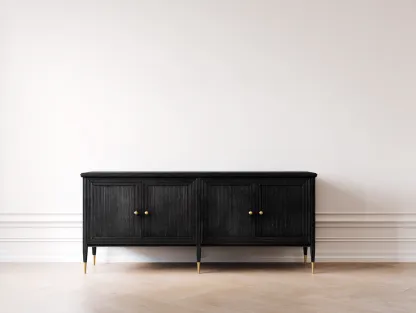 La estructura está fabricada con madera resistente y acabado en color negro que resalta la textura del material. Los tiradores metálicos de tono dorado aportan un contraste elegante y un detalle decorativo que complementa el diseño del mueble.