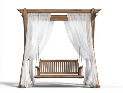 La estructura está fabricada en madera maciza con acabado en color marrón que resalta la textura natural de la madera. El asiento suspendido se fija mediante cadenas metálicas resistentes que proporcionan estabilidad durante el uso. Las cortinas decorativas en tejido ligero de color blanco aportan un aspecto elegante y permiten regular la entrada de luz.